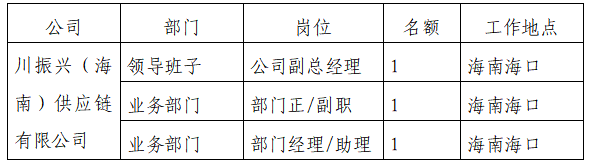 川振兴集团(海南)有限公司根据业务发展需要,现面向社会公开招聘川振兴(海南)供应链有限公司人员,有关事项公告如下。