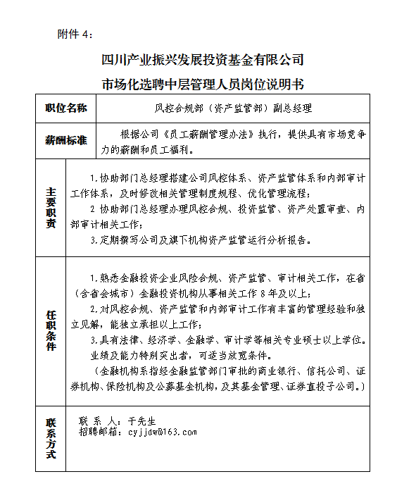 根据四川产业振兴投资基金集团公司干部队伍建设和本部部门管理工作需要,拟面向社会公开选聘公司本部部门中层管理人员4名。具体如下: