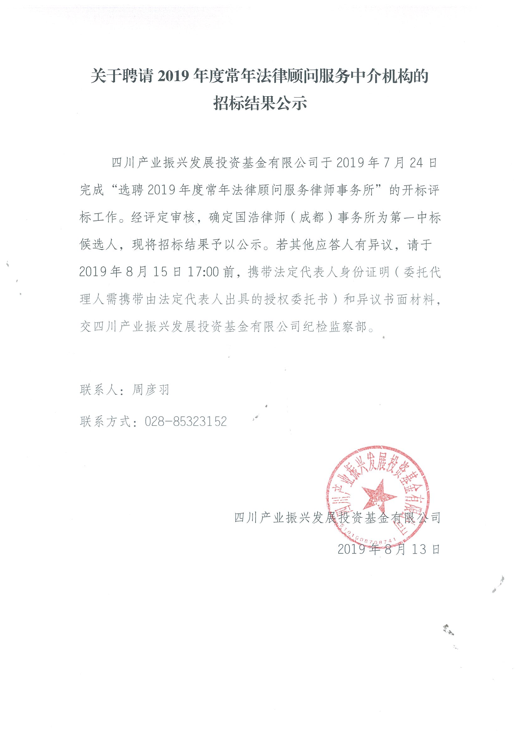 关于招聘2019年度常年法律顾问服务中介机构的招标结果公示