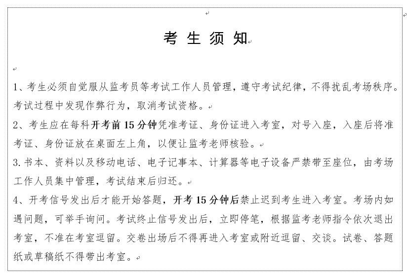 (三)请按照通知时间准时参加考试,13:20将组织签到、寄存物品、现场抽签,开考前15分钟进入考场,开考15分钟后不得入场。请严格遵守考场纪律。