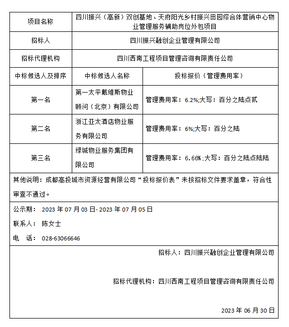 四川振兴(高新)双创基地、天府阳光乡村振兴田园综合体营销中心物业管理服务辅助岗位外包项目中标候选人公示