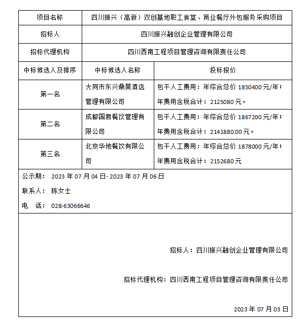 四川振兴(高新)双创基地职工食堂、商业餐厅外包服务采购项目中标候选人公示