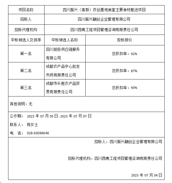 四川振兴(高新)双创基地食堂主要食材配送项目中标候选人公示
