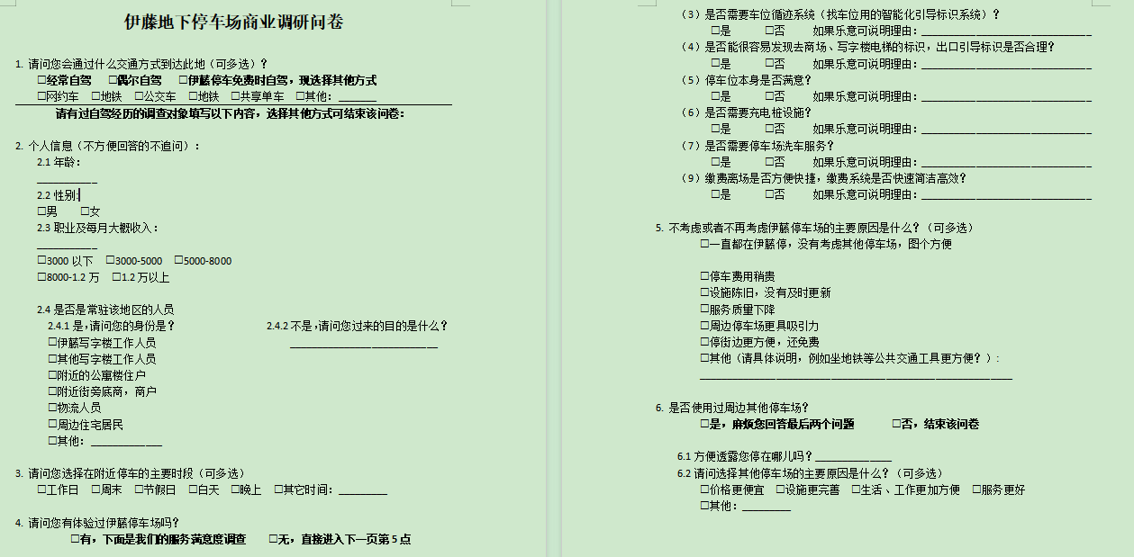我司结合田野调查、问卷调研等多种方式,针对伊藤广场锦峰写字楼、云图写字楼上班族,周边底商和流动人群等客群投放问卷500余份,累计产生近200份合格样本。本问卷通过先询问调查对象的通勤工具,到他们对停车场的满意度,到对伊藤停车场设施的建议,再到选择其他竞品停车场的理由,以选择题为主,填空题为辅,受访对象可选择性回答的模式,做到了逻辑上严密,充分尊重受访者的意愿和隐私。在田野调研方面,做到热情、礼貌,表现处处为客户着想的心态,得到了受访者的诚意回馈。
