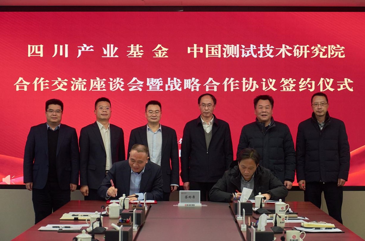 12月28日,四川产业振兴发展投资基金有限公司与中国测试技术研究院举行座谈会并签订战略合作协议。中国测试技术研究院党委书记、院长周传军,四川产业基金党委书记、董事长黎家远出席签约仪式。中国测试技术研究院党委委员、副院长陈世超,四川产业基金总经理助理、振兴实业董事长刘怀笔代表双方签署战略合作协议。双方将在传感器公共服务平台建设、检测校准业务、科技成果转化等方面开展全方位务实合作,共建高水平创新联合体,在推进科技创新和科技成果转化上同时发力,积极服务四川现代化产业体系建设。