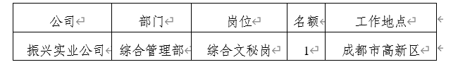 四川振兴产业园实业有限公司(简称“振兴实业公司”)系四川振兴集团全资子公司,公司根据业务发展需要,现面向社会公开招聘振兴实业公司工作人员,有关事项公告如下: