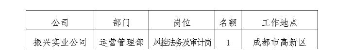 四川振兴产业园实业有限公司(简称“振兴实业公司”)系四川振兴集团全资子公司,公司根据业务发展需要,现面向社会公开招聘振兴实业公司工作人员,有关事项公告如下: