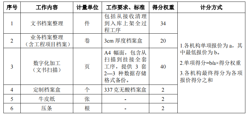 各相应机构按以下工作内容分别报价(单价),满分100分,各项工作内容报价得分权重及计分方式如下: