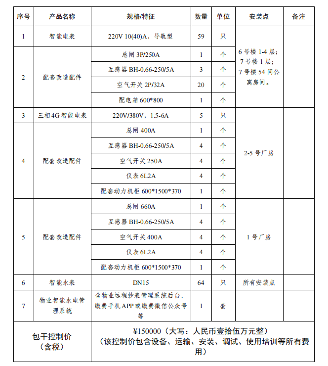 含税控制总价为¥150000(大写:人民币壹拾伍万元整)。该控制价包含设备、运输、安装、调试、使用培训等所有费用。