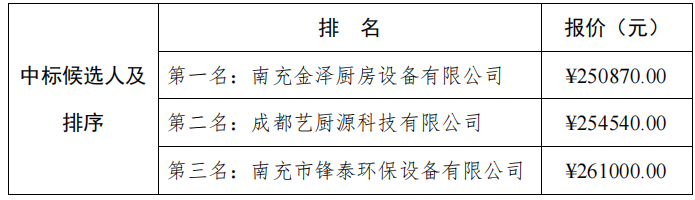 南充振兴产业园实业有限公司食堂专用设备询价采购项目已完成询价采购,现将询价比选结果公告如下: