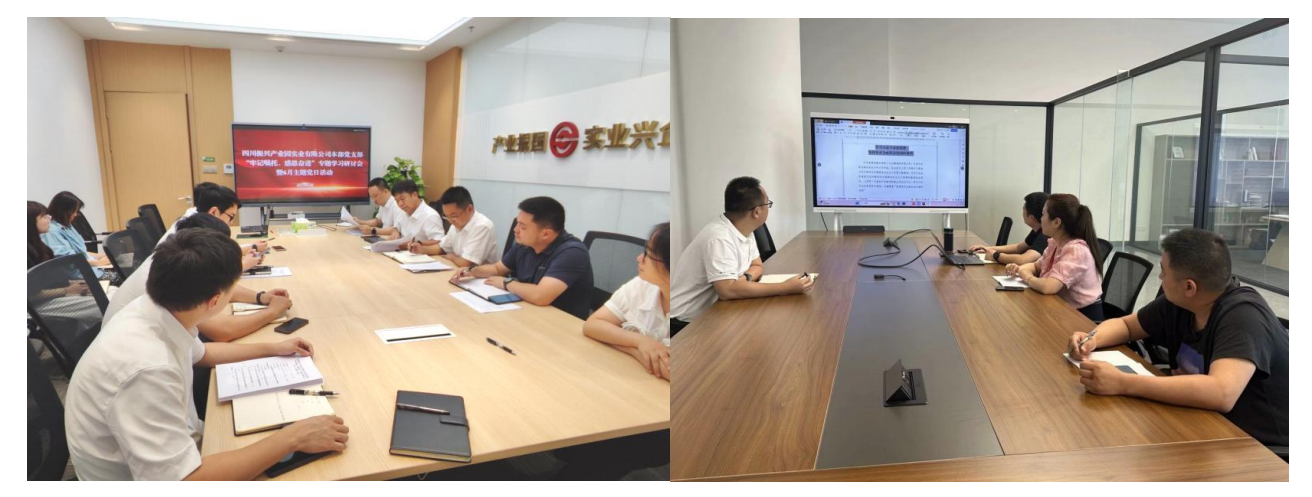 中国共产党成立102周年前夕,为深入学习贯彻习近平新时代中国特色社会主义思想、习近平总书记来川视察重要讲话和重要指示精神,弘扬伟大建党精神,根据产业振兴基金党委统一安排,振兴实业党总支下属3个党支部于2023年6月28日分别设立分会场,开展“牢记嘱托、感恩奋进”专题学习研讨会暨6月主题党日活动,党总支副书记曾云川、纪检委员邓鞒以普通党员身份参加振兴实业本部党支部专题研讨,公司董事、副总经理、无党派代表人士蒋楠受邀在线上参加研讨。