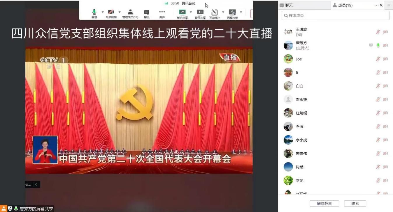 10月16日,中国共产党第二十次全国代表大会在北京开幕。上午十点,四川众信党支部通过腾讯会议组织全体员工共计19人一起观看了开幕会。
